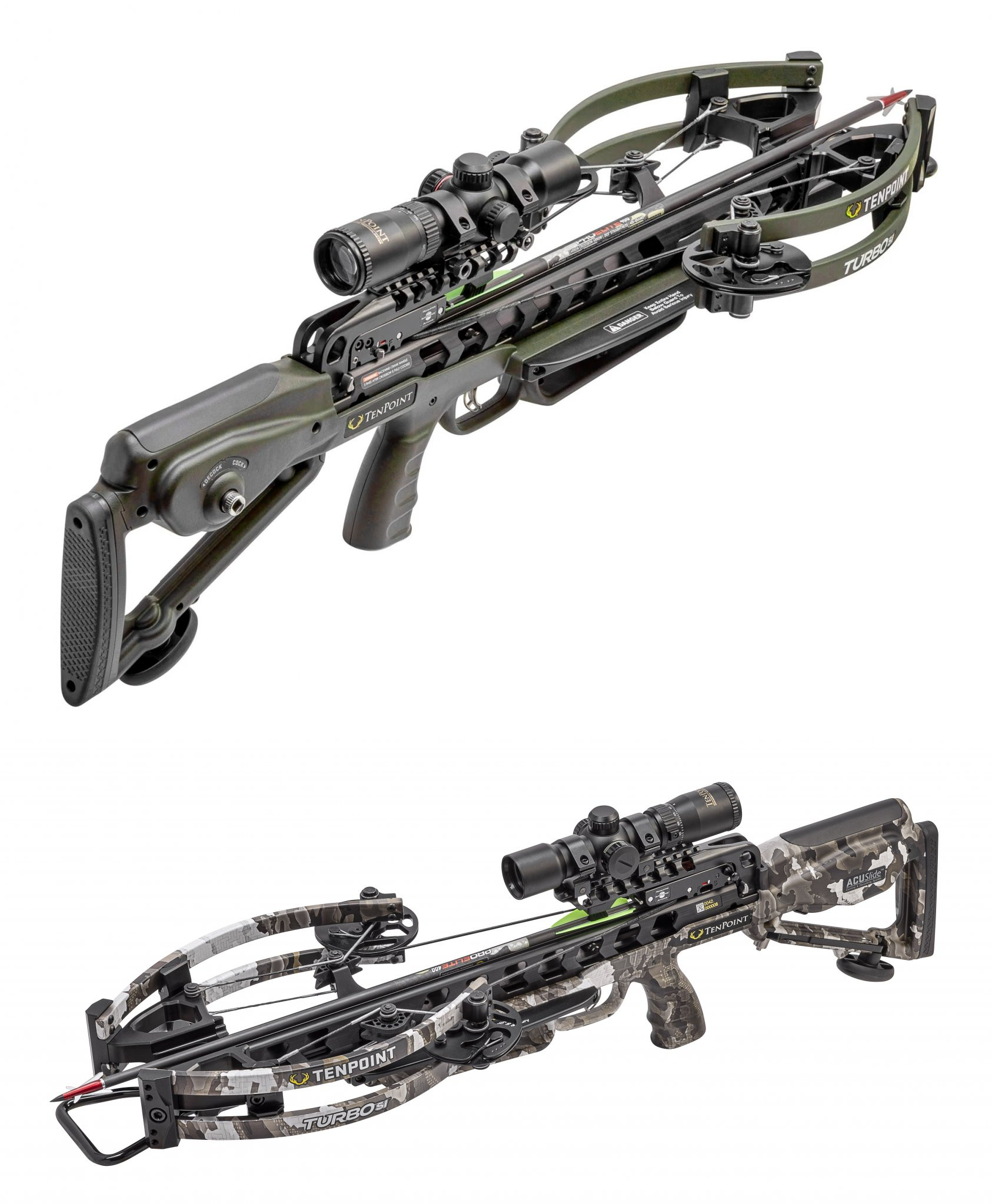 The TenPoint crossbow with ACUslide and the best price performance ratio. Featuring silent easy cocking and safe-de-cocking, the Turbo S1 is our shortest forward-draw crossbow ever, measuring an ultra-compact 31-inches long, and delivering speeds of 390 feet per second. This is the affordable short crossbow you’ve been looking for! The short crossbow is equipped with the RX-6 Cam System, a 2-stage, zero-creep S1 Trigger that delivers a consistent crisp, 3.5-pound pull, and the cocking and safe de-cocking system dealers recommend most – the ACUslide. Requiring just 5-pounds of force to operate – a fraction of the force required on competitors bows – the ACUslide provides easy cocking and de-cocking. Forget the hassle of carrying a target to discharge your bow, or risking damaging an arrow by discharging it at the end of the hunt – safely de-cock the crossbow by backwinding the handle, and unlike other de-cocking systems on the market, stop at any point without the fear of damage, injury, or losing control. |